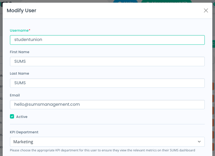 When creating or modifying a SUMS user, you can select a KPI department to apply to the user. Your System Administrator typically manages your SUMS Users, so they can ensure the correct KPI departments are applied to staff members.