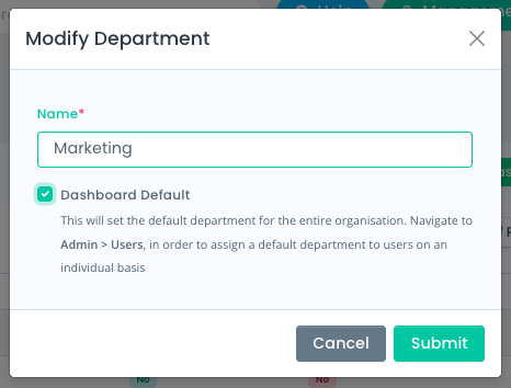 Before creating your KPIs you will first need to setup departments to assign your targets to, and you can set 1 department as the Dashboard Default - any KPIs assigned to that department will then appear within the KPI Widget on the SUMS dashboard, and the main KPI dashboard.
