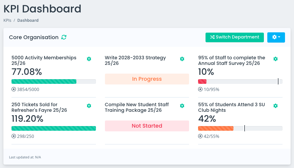 Those who have permission to create and manage KPIs will be able to view these within the KPI module itself. However, you can also display an overview of KPIs to users via the main SUMS dashboard, ensuring staff members can retain an oversight of the progress of core KPIs.
